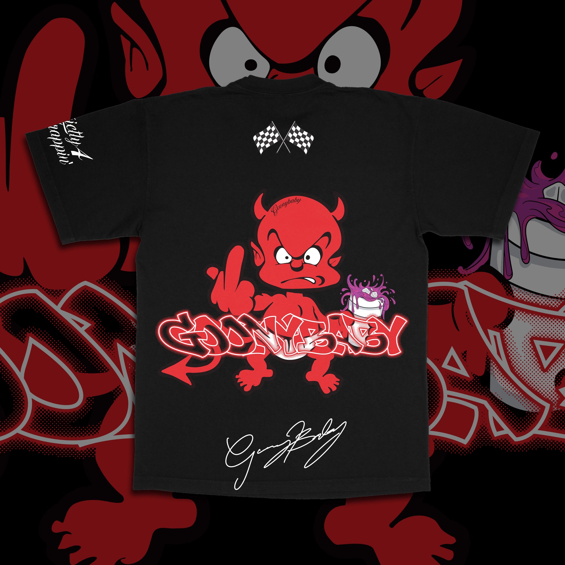 This isn’t just a T-shirt—it’s a statement. The Red Devil Tee from Goony Baby blends bold iconography with elevated craftsmanship. Featuring a screen-printed red devil graphic on both the back, plus subtle embroidery hits that lock in the detail, this piece is layered in intent and attitude.